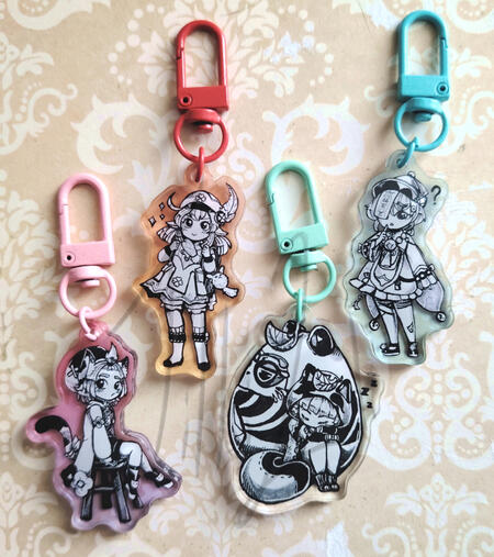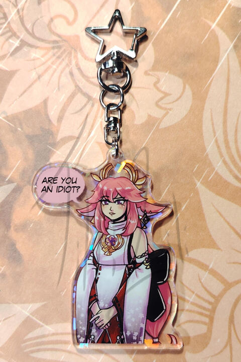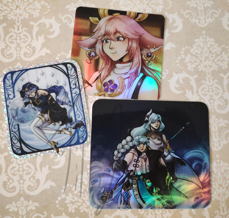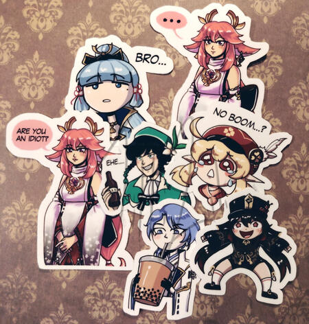 Genshinistä on myynnissä tarroja ja avaimenperiä.